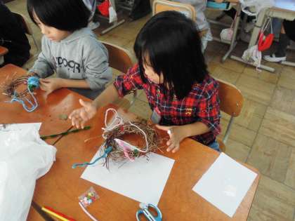 1年生の生活科では、あさがおの蔓で作ったリースに飾りをつけました。