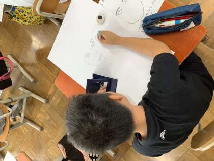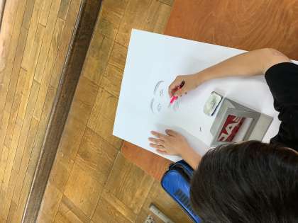 「眉毛からすーっと横にいくと、耳の上にたどりつくよ!」