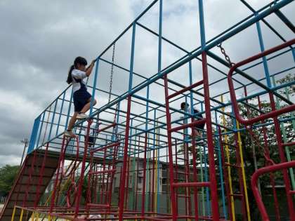 総合遊具でのルールを守りながらそれぞれが登れる所まで登る練習をしました。