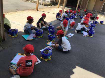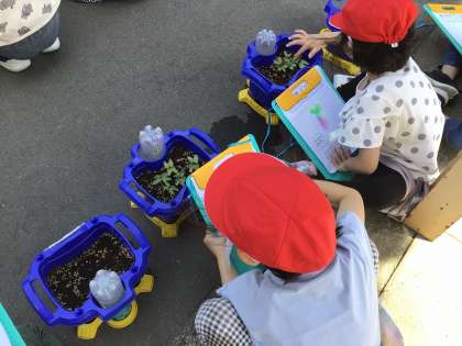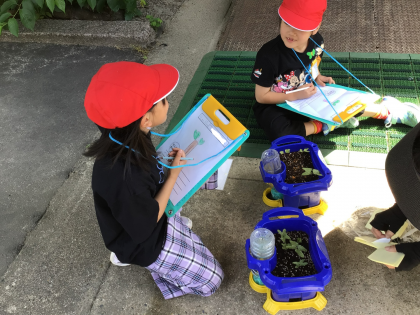 目で見て、手で触って、匂いをかいで、いろいろな方法でアサガオの芽を観察しました。
