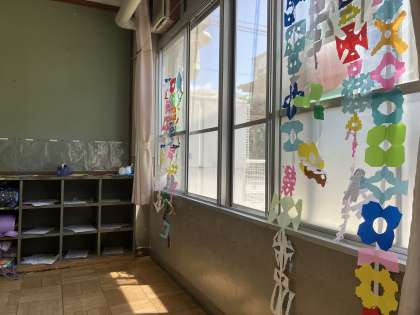 今日は前回作った飾りを紙テープにくっつけて、飾りを完成させました。