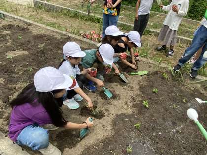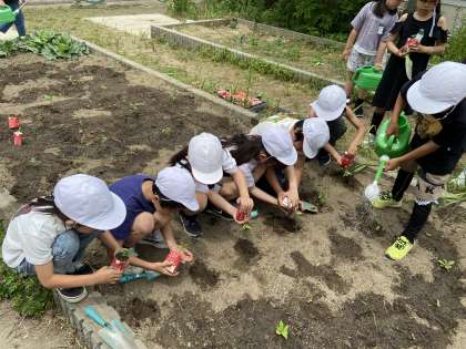 苗で育てていた、ひまわりとホウセンカを畑に植え替えました。