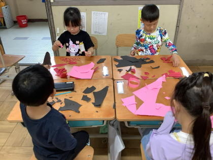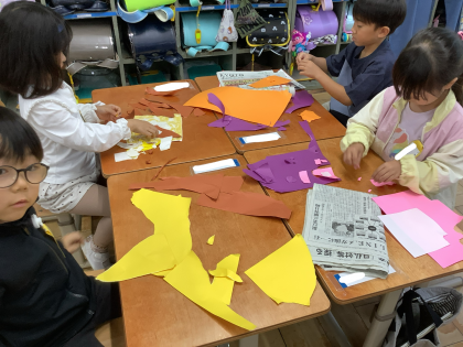 全体で破いたあと、できた形を組み合わせたり重ねたりしながらさらに何に見えるかを考えました。