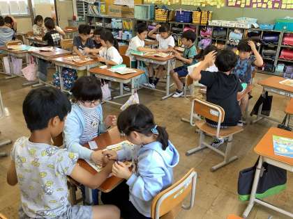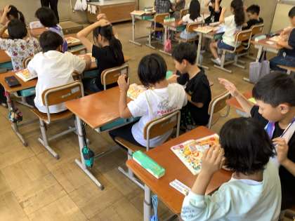英語で言われた数を聞いて、おはじきをとったり、じゃんけんをして何回かったかを数えたりしました。