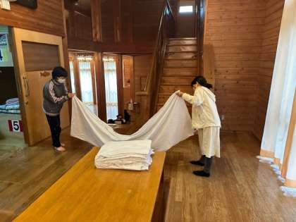 おはようございます。いよいよ最終日です。まずは使用した寝具をきれいに片付けます。