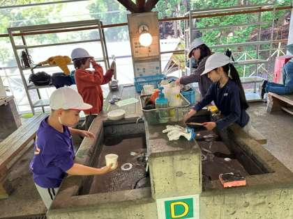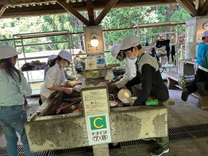 野外炊事のスタートです。まずは使う用具を洗います。