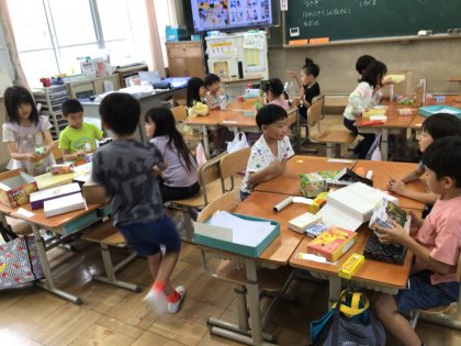 箱や空き缶を使って動物や乗り物を作りました。