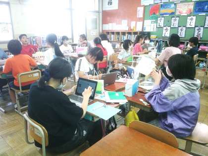 図画工作科で、画用紙と針金で動くしかけを作っています。
