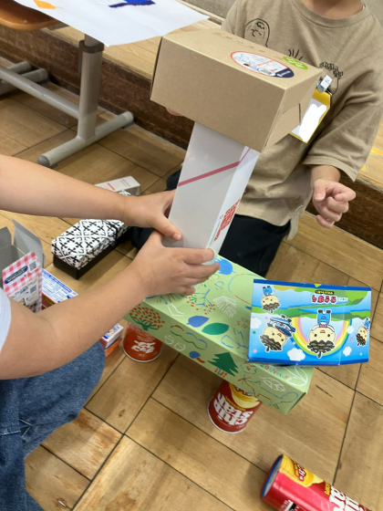 算数では箱や空き缶などを使って、動物や乗り物を友達と協力しながらつくりました。