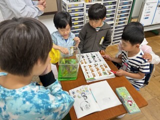みんなで図鑑を見ながらどの蝶になるのかを調べていました。