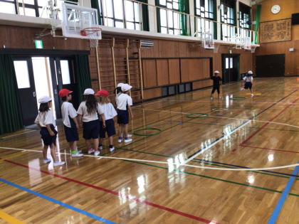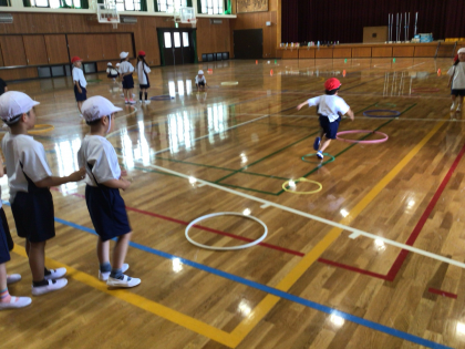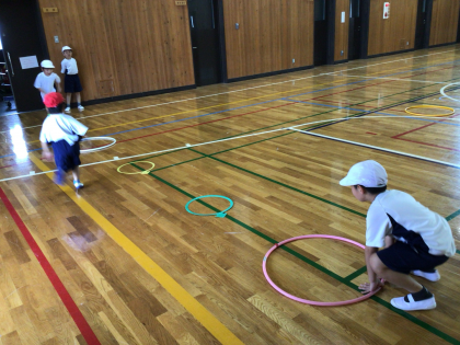 島とび遊びでは、グループで声をかけあって大きな島とびをつくって遊びました。
