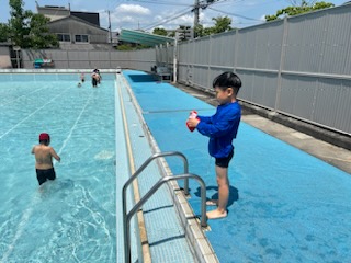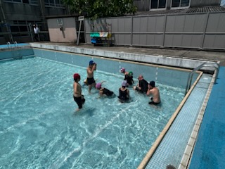 今年初めてのひまわり学級での水泳学習を行いました。気温も丁度良くとても活動しやすかったようです。子どもたちは「じごくのシャワーや!!」と言いながらシャワーに入ったり、ワニ歩きをしたりとても楽しそうでした。