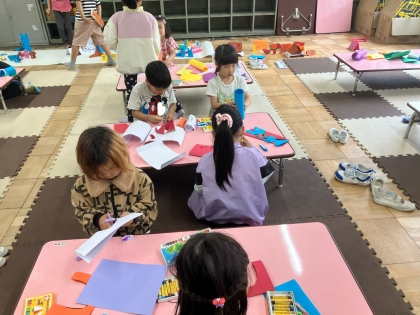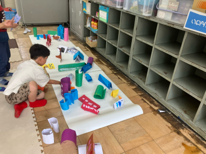 今日は先日作った作品を並べて、1年2組の町を作りました。