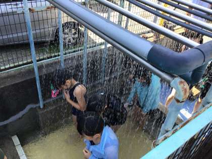 体操をして、シャワーを浴びて、水なれをしています。