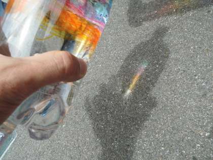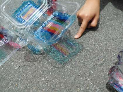 図画工作で透明な容器に色を付けて光に当ててみました。