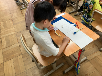 のこりはいくつになるのかを、数図ブロックを使って考えます。