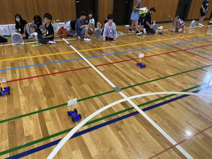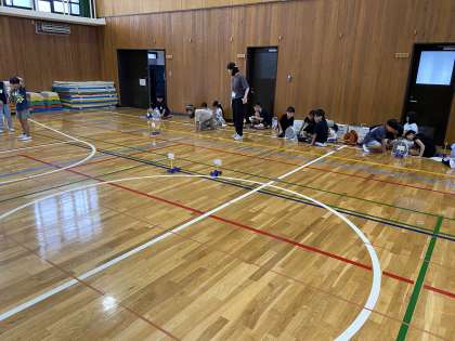 送風機を使って、車に強い風を当てた時と弱い風を当てた時の違いを実験して調べています。