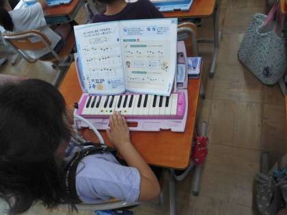 2年生の音楽の学習の様子です。音楽では鍵盤ハーモニカの練習をしています。指番号を確認しながら、1つずつ丁寧に演奏をしました。