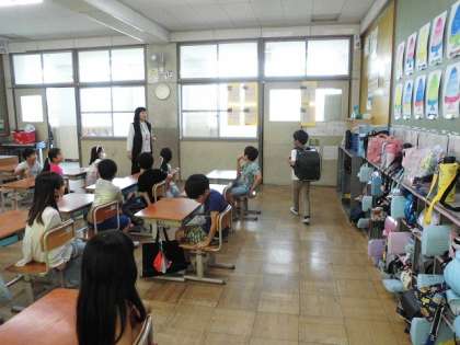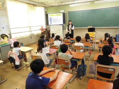 伏見警察署のスクールサポーターの方に不審者についていかないためにどうするか、社会の中でどのように過ごすか、決まりやルールについてのお話をしていただきました。