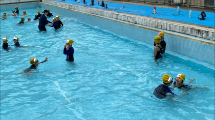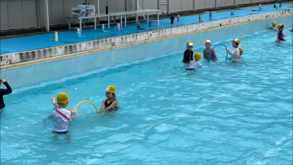 今日は水慣れと鬼遊びをした後、2クラスに分かれてひきふねとフラフープを使って輪くぐりをしました。