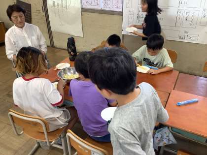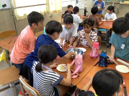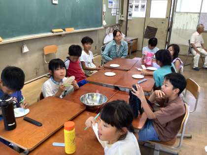 つくった粉ふきいもを教室でお世話になっている農業委員さんといっしょに食べました。
