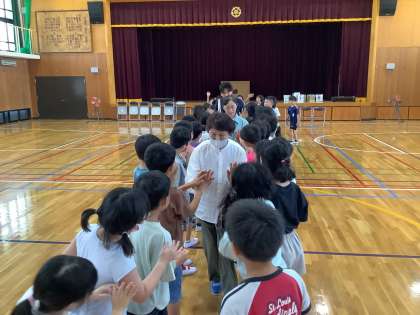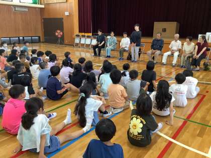 じゃがいもパーティーの最後に体育館で、農業委員さんからのお話を聞いて、感謝の気持ちを伝えました。