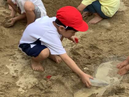 裸足になり、砂の感触を味わったり大きな砂山を作ったり水を混ぜた時の感触の違いを感じたりいろいろな感触を楽しみたっぷり仲良くなりました。