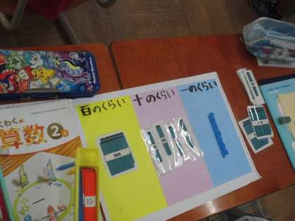 計算棒を使って、10や100のまとまりを作ってくり上げることを手を使って、学びました。