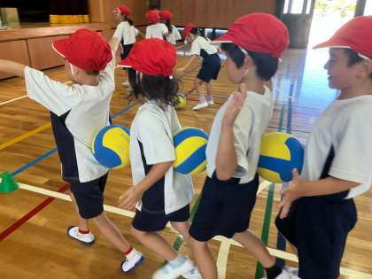 ボールを使った遊びでは、3〜4人組でボールをお腹と背中に挟んでリレーもしました。
