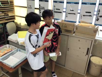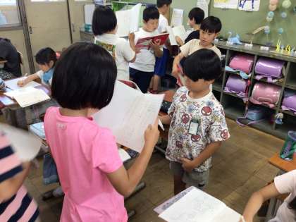 「わたしと小鳥とすずと」と「夕日がせなかをおしてくる」を読んで、想像した様子を友だち同士で交流しました。