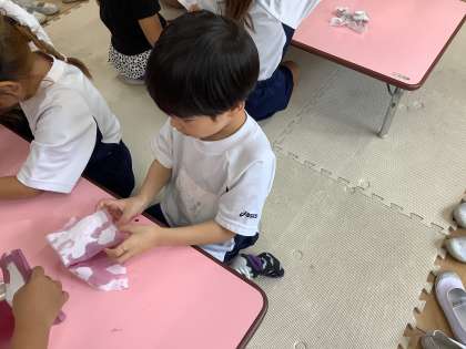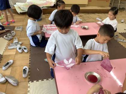 大切に育てた「あさがお」の花を持ち寄って色水を作り、染め紙を折って「おりぞめ」をしました。