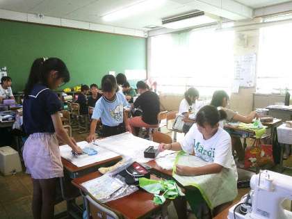 家庭科でグループで助け合いながら、エプロンを作っています。