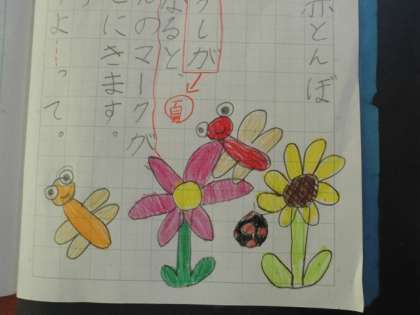 「赤とんぼ」という詩を読んで、思ったことを絵に表現してノートにかきました。