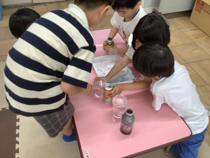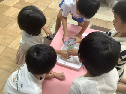 水をうつして比べたり、同じ大きさの入れ物に入れて比べたりしました。