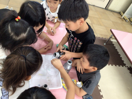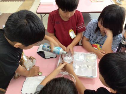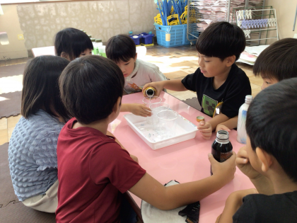 様々な大きさの容器を使って水のかさの大きさ比べをしました。一つの容器に入れた水を移して大きさを比べたり、同じ大きさのカップ何個分の水が入るかで比べたりして学習しました。もっといろいろなものの大きさ比べをしてみたいと話していました。