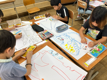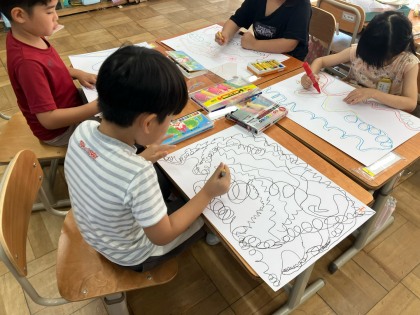 図画工作では、ペンで「くねくね」「ぐるぐる」「でこぼこ」などの線を描きその線の上でどんな冒険が始まるかを想像しながら、絵を描きました。