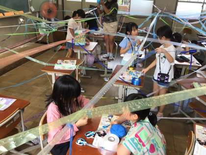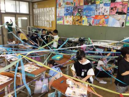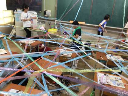 教室を使って、いろいろなひもをつないでみんなで造形活動をしました。