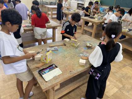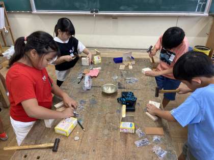 くぎを打って作品を作ります。初めて金づちを使う人も多くいましたが、みんな楽しんでいました。