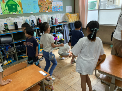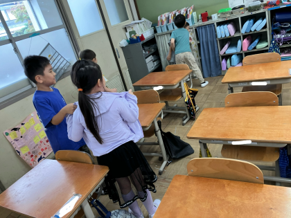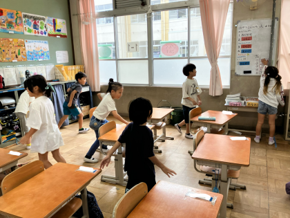 最後はカラータッチゲームで、英語で言われた色を教室の中から探し、触りにいくというゲームをしました。