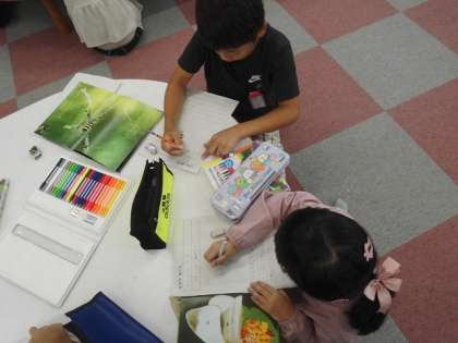 見つけた虫をカードにかいたり、図鑑や虫の体のしくみをじっくりと見ながら学習をしました。