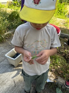 さつまいもほりの最中にとても大きなバッタを見つけました。
