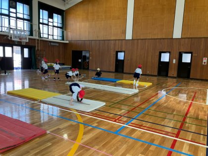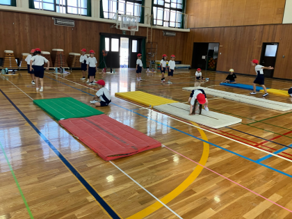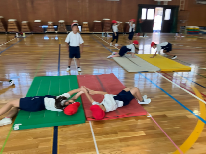 川飛びでは、マットを踏まないようにお尻を高く上げてとぶことを意識しました。