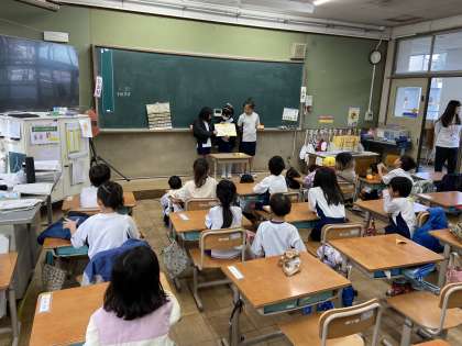 話し合って決めた1年生にお勧めする本を1年生に紹介しています。