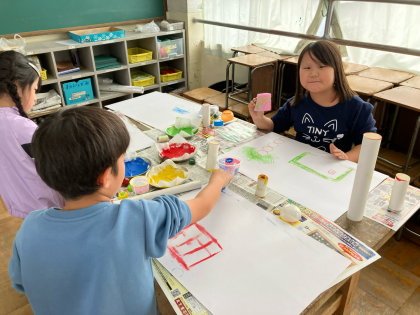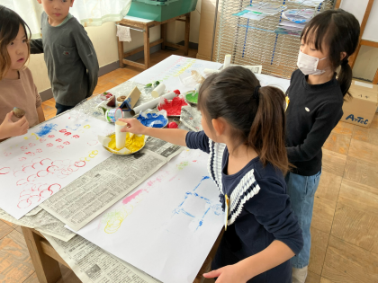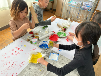 今日は図画工作で、色々な材料を使ってスタンプ遊びをしました。