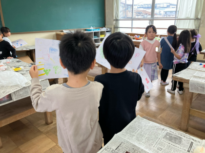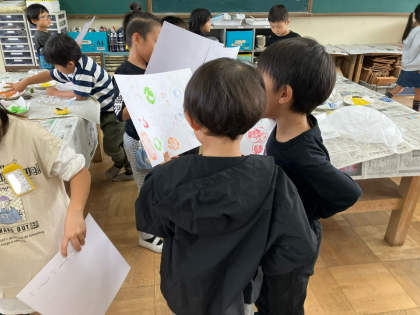 できた画用紙を持って、どんな形ができたかを交流しました。