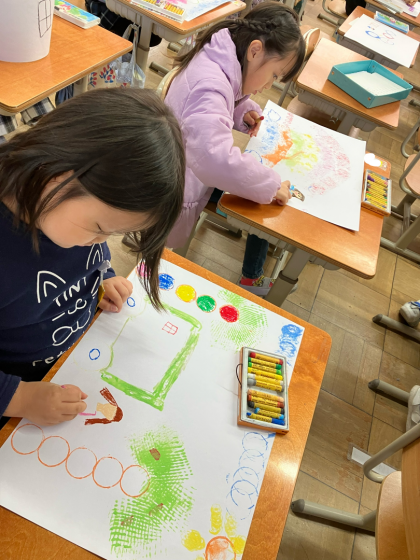 今日は、前回スタンプを押した作品がもっと素敵になるようにクレパスで描き足しました。