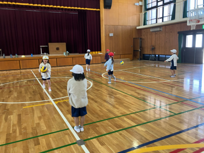 二人組で、相手が取りやすいボールの投げ方を意識しながら声をかけ合って上手にボールをパスしていました。
