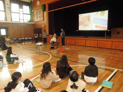 総合的な学習の時間の授業で、身体障害児者父母の会連合会の職員の方々と利用者の方が下鳥羽小学校へ来てくださいました。