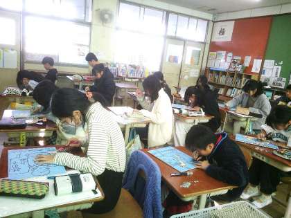 図画工作科では、日本文化というテーマで、版画の題材を選らび、掘り進めています。