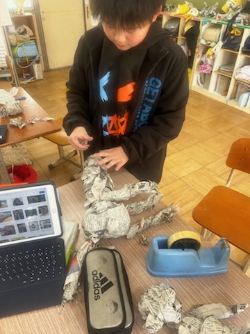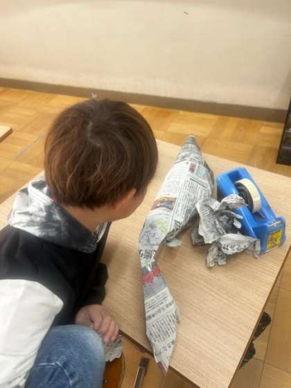 新聞紙を使って立体の生き物を作っています。